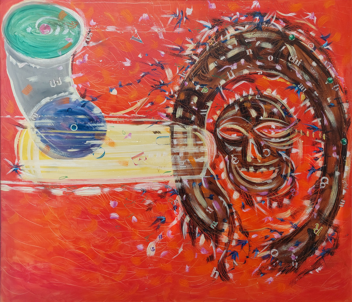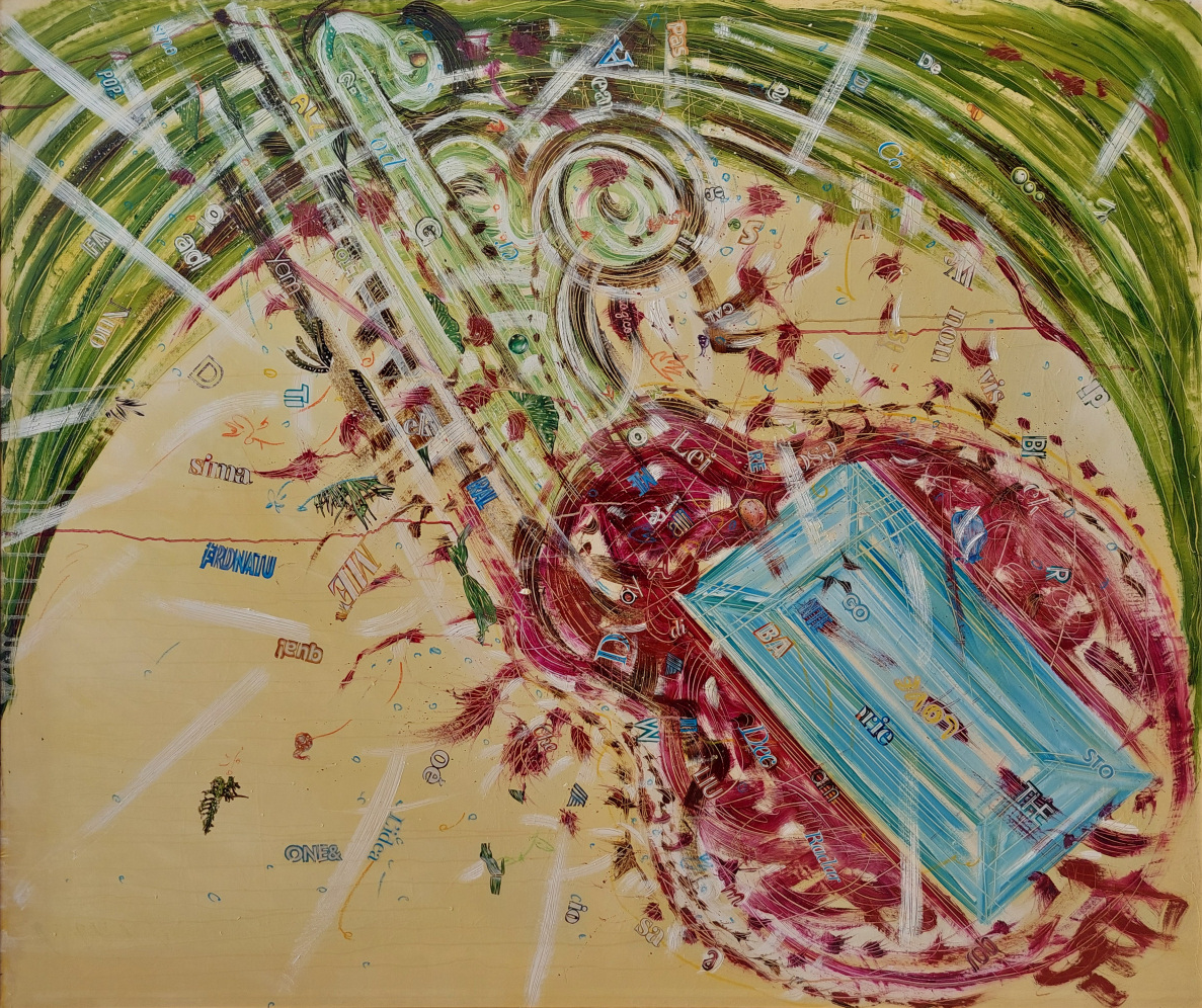 Io che esco dalla bocca della balena, 2025, olio, pastello grasso e collage su tela, cm 132 x 140 |